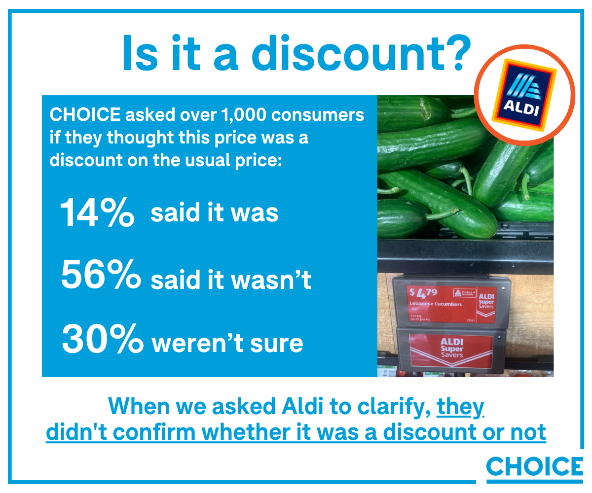 CHOICE asked over 1,000 consumers if they could tell if a variety of price tags photographed at Woolworths, Coles and Aldi stores represented discounts on the usual price, and how easily and quickly they were able to determine whether it was a discount or not.