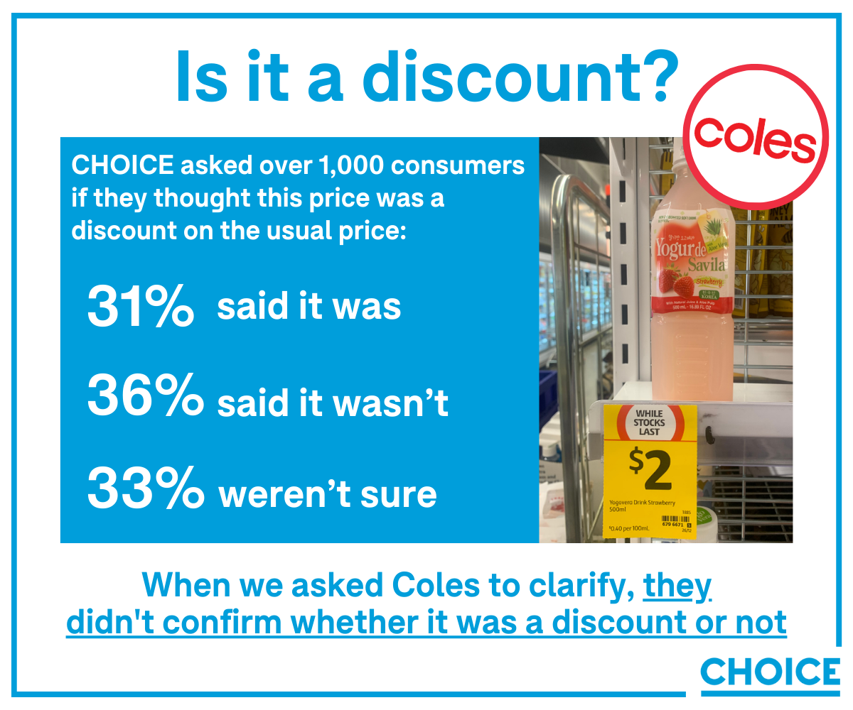 "This Coles 'while stocks last' tag caused the most confusion. When we asked our respondents if this price was a discount on the usual price, approximately one third believed the product was discounted, roughly another third believed it wasn't and the remaining third were not sure," says CHOICE Director of Campaigns, Rosie Thomas.