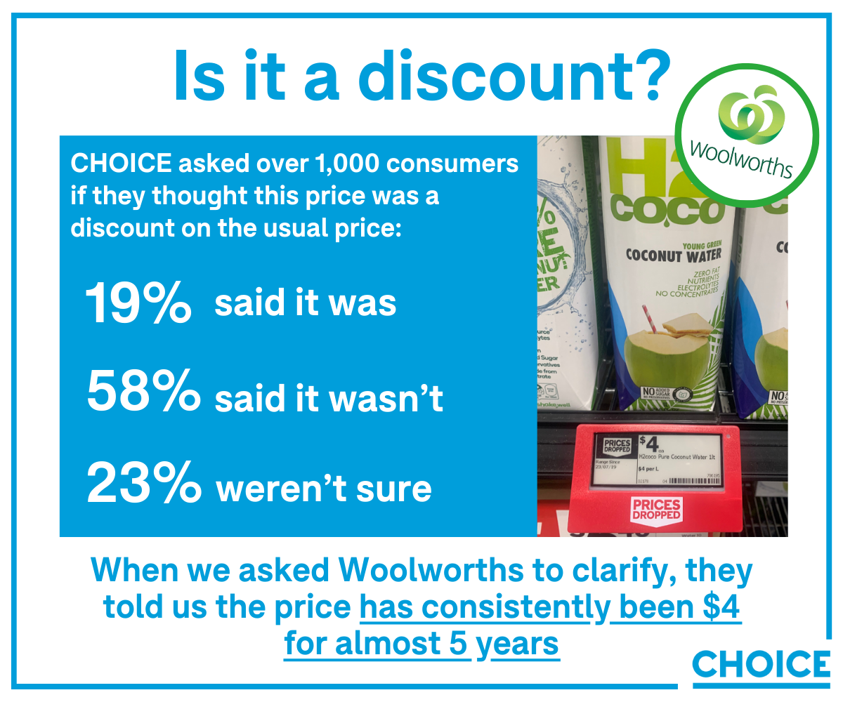 "This Woolworths 'prices dropped' label also confused respondents, with only half of respondents saying they could quickly and easily tell if the product was discounted or not," says Thomas.