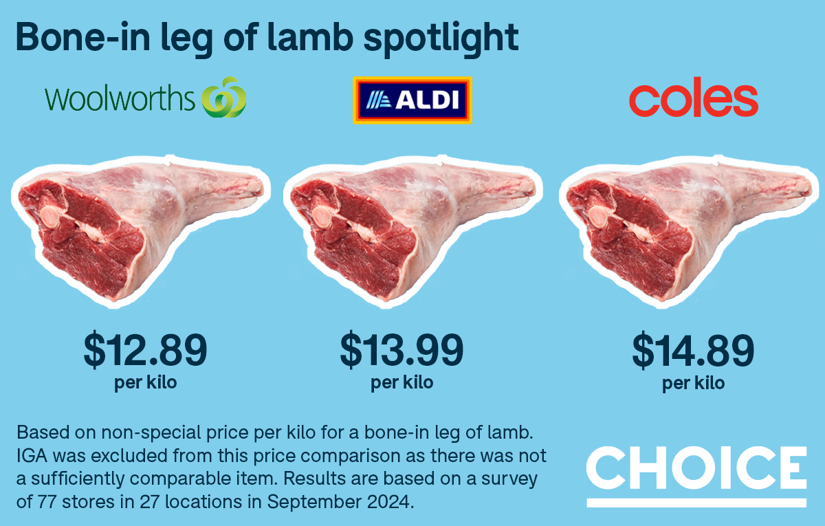 "Coles and Woolworths came equal first nationwide when we looked at the best price for a leg of lamb with specials. Coles and Woolworths both sold a leg of lamb at an average of $12.89 per kilo, while Aldi came in third place at $13.99 per kilo," says CHOICE CEO, Ashley de Silva.