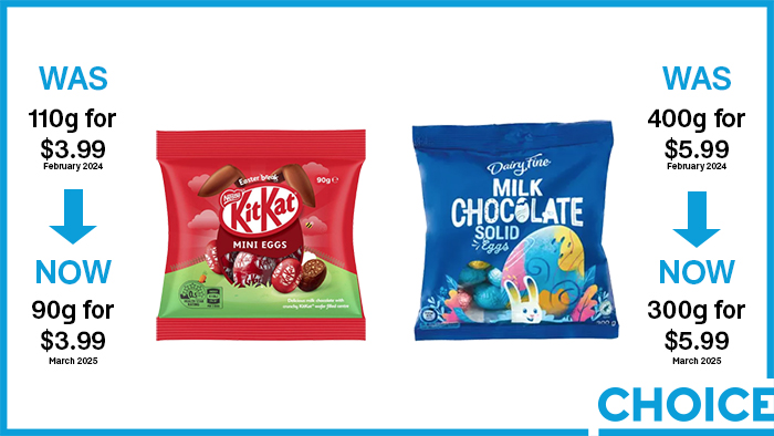“Aldi’s packets of Dairy Fine Milk mini eggs have also decreased in size, going from 400g t to 300g. While the price has remained the same at $5.99, you’re now paying 33% more per 100g to get your chocolate fix,” says Kennedy.