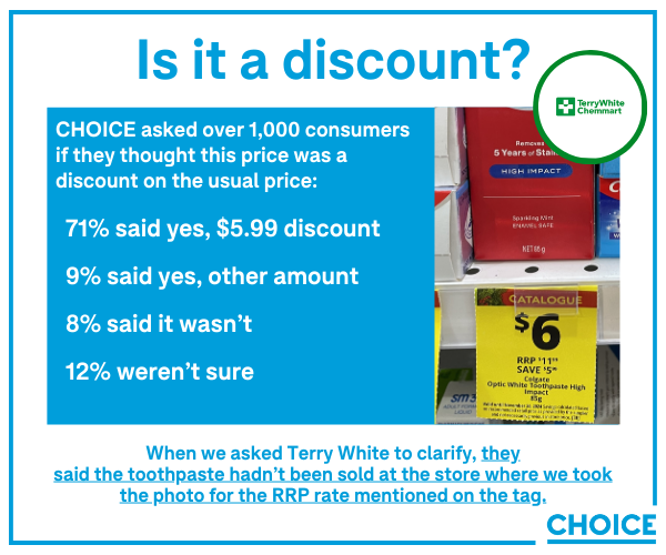 “In this example, over two thirds of consumers thought Terry White was providing a $5.99 discount on this toothpaste. You can see why, as the tag lists the product’s $6 price as a discount on the RRP of $11.99. However, when we asked Terry White if they’d previously sold the toothpaste for $11.99, they confirmed it had never been sold at that price at the store where we took the photo,” says Sherwood.