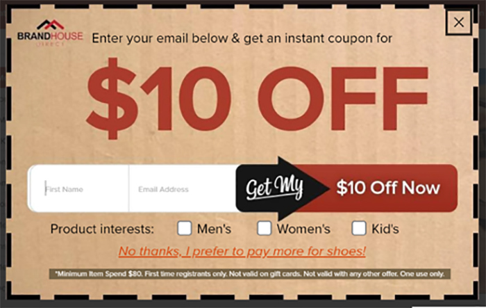 CPRC’s sweep found that the shoe retailer, Brand House Direct, offers two options on the email subscription pop-up as soon as you enter its website. One has the wording ‘Get $10 off Now’ and the other in small font states ‘No thanks, I prefer to pay more for shoes!’. These types of tactics can manipulate both purchasing and data-sharing decisions.