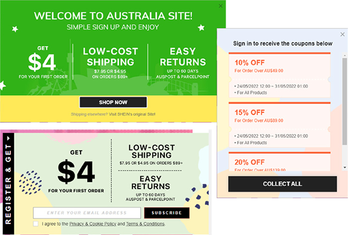 For example, Shein’s website forces users to navigate through three different pop-ups before you can browse its website. Other websites seem to watch where and how you move your cursor, so if it looks as if you’re about to leave, a pop-up will appear encouraging you to stay.