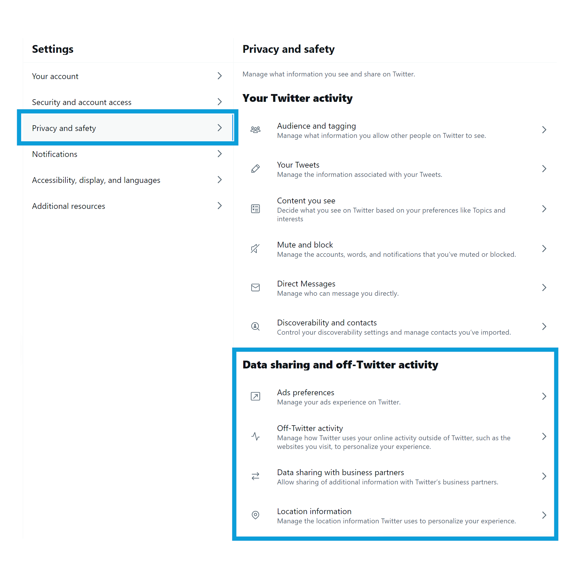 To stop Twitter sharing your information, go back to the “Data sharing and off-Twitter activity” section and click Data sharing with business partners, then untick Allow additional information sharing with business partners.