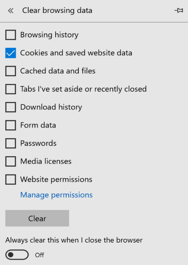 To delete the cookies you already have, go to Settings then under Clear browsing data, click Choose what to clear. Make sure Cookies and saved website data is ticked, then hit Clear.