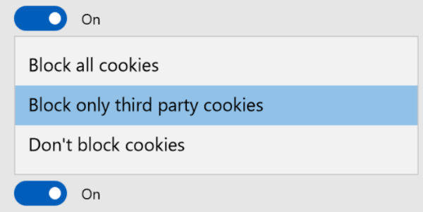 Click the ellipsis (…) icon at the top right and select Settings. Scroll down and under Advanced settings, select View advanced settings. Scroll down again and under Cookies there are three options: Block all cookies, Block only third party cookies and Don’t block cookies.