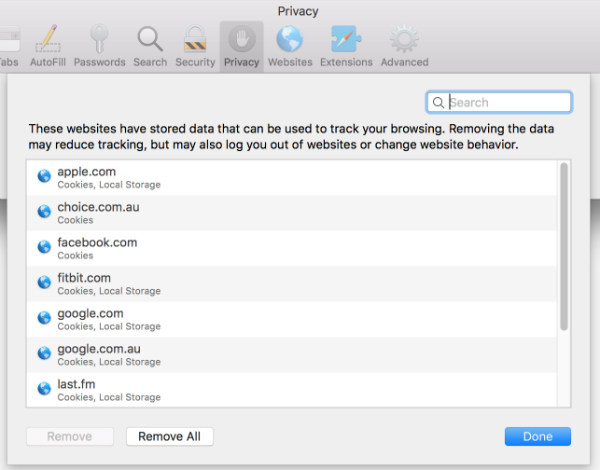 To delete the cookies you already have, click Manage Website Data and select cookies from individual websites on the list and click Remove, or select Remove all to delete the lot.