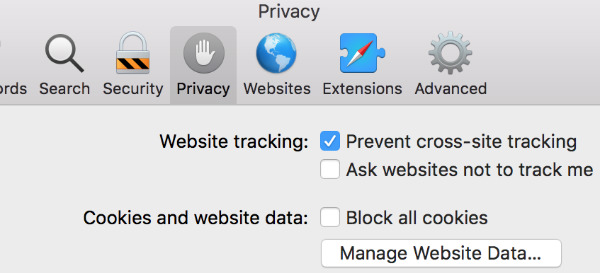 To manage your cookie settings, open Safari and click the Safari menu at the top-left (next to the Apple menu) and select Preferences. In the following window, select Privacy.