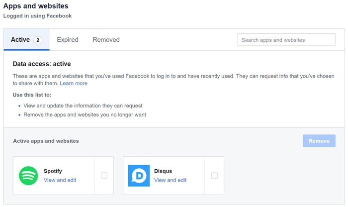 - Active apps and websites are ones you've logged into within the last 90 days. These can still request from Facebook the information you agreed to share with them when signing up.