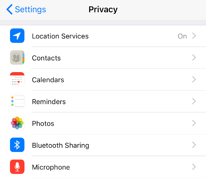 In Settings, go to Privacy and tap each of the items listed to see more information and turn permissions on or off.