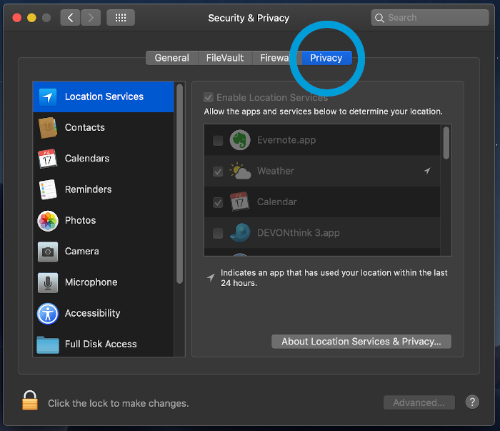 In the panel that opens, select Security & Privacy, then open the Privacy tab.
