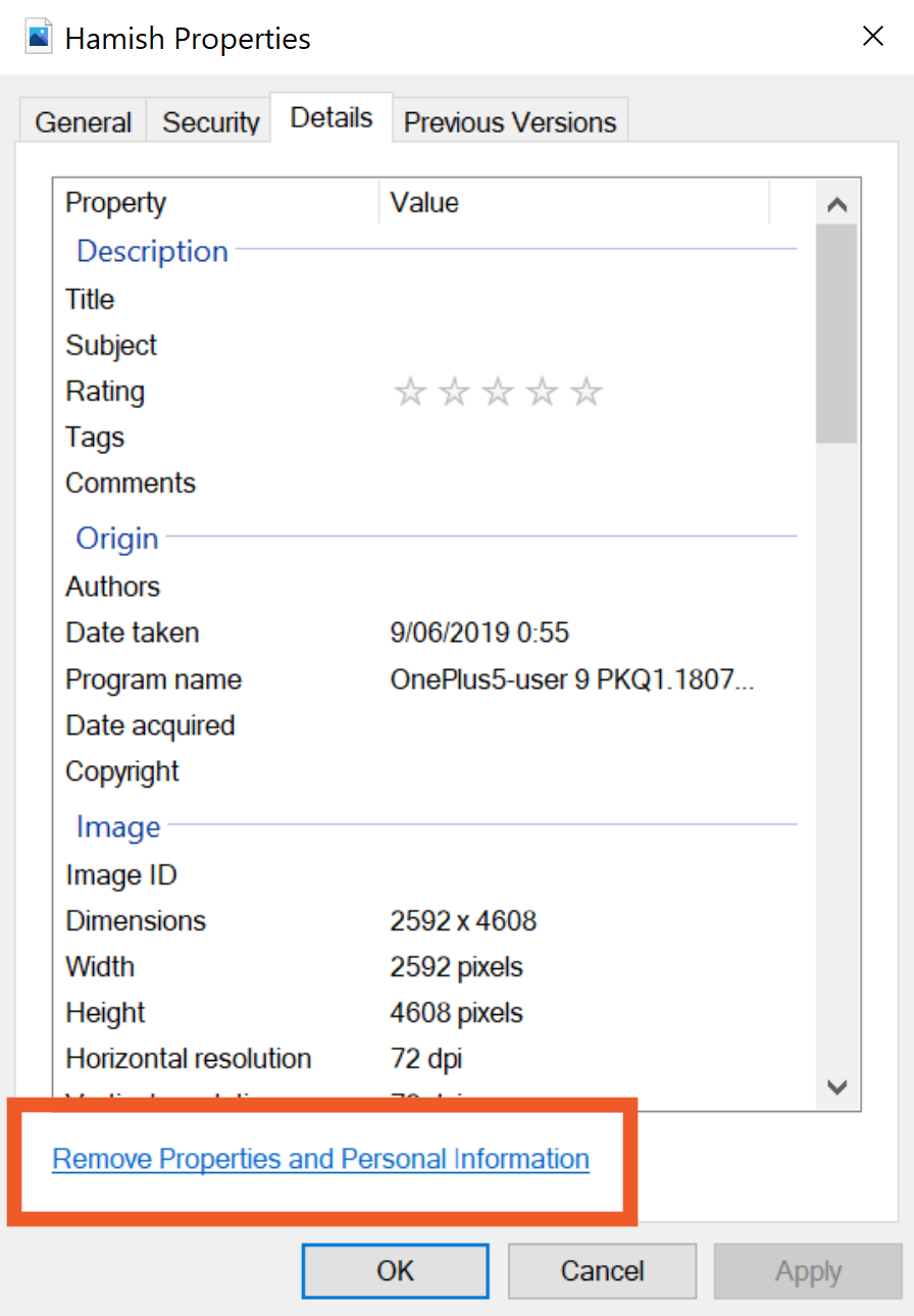 Any data left in the Details tab should be general, such as the dimensions of an image, or for use of your operating system and local network to identify the file, such as owner and computer name.