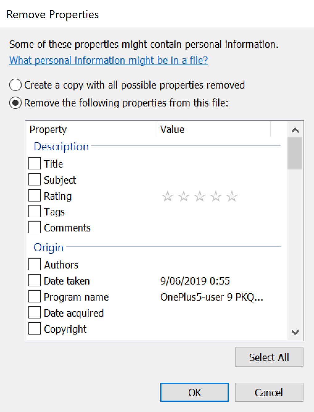 It’s up to you which you choose. If you choose the second option, you can either select types of metadata individually or click Select all. Hit OK to finalise.