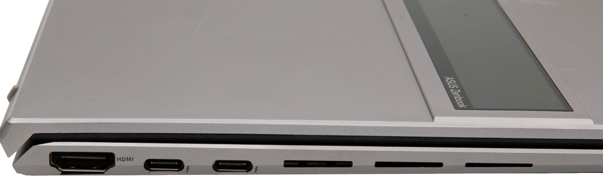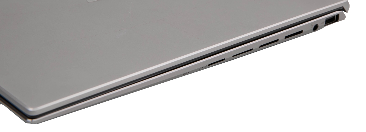 Ports include two Thunderbolt 4 USB-C ports, plus a full-sized HDMI 2.0 port and a USB 3.2 Gen-2 Type-A port, plus a microSD card slot which sits alongside three air vent slots, and microSD cards don’t sit all the way inside the slot. There’s also a headset port.