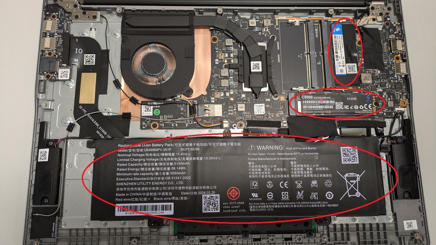 SATA storage drives and batteries are typically screwed and/or clipped in place. Remove the screws or give these parts a gentle wiggle to feel for any give. If the storage and batteries don’t budge, they’re probably designed to stay put.