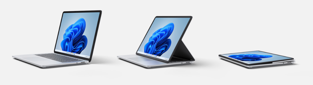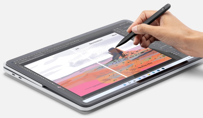 The fold-forward from the base action is made possible by what Microsoft calls an “ultra-durable Dynamic Woven Hinge”. This gives the user three modes – laptop mode for normal use; stage mode for viewing and presentations; and studio mode laid flat for writing, drawing and other work using the optional Slim Pen 2 ($190). Magnets are used to hold the screen firmly to the base in all three positions.