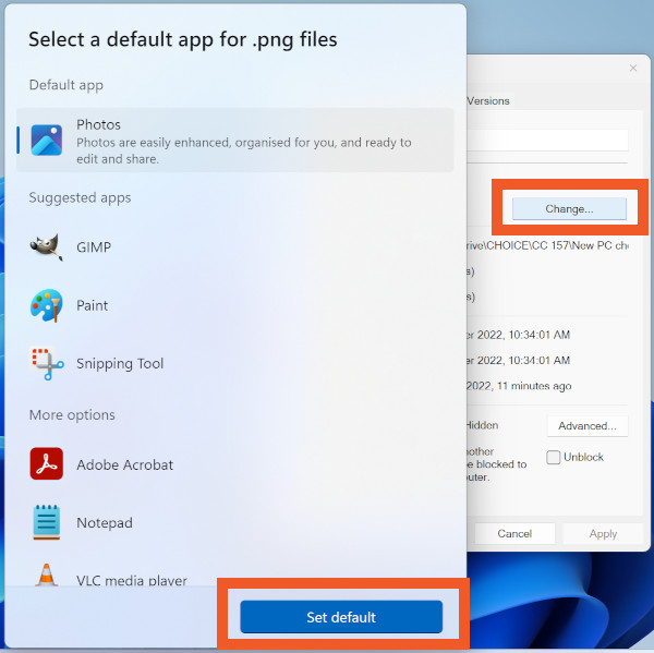 In the General tab, to the right of “Opens with”, click on Change… Select the program you want and click Set default. From now on, that’s the default app for that file type.