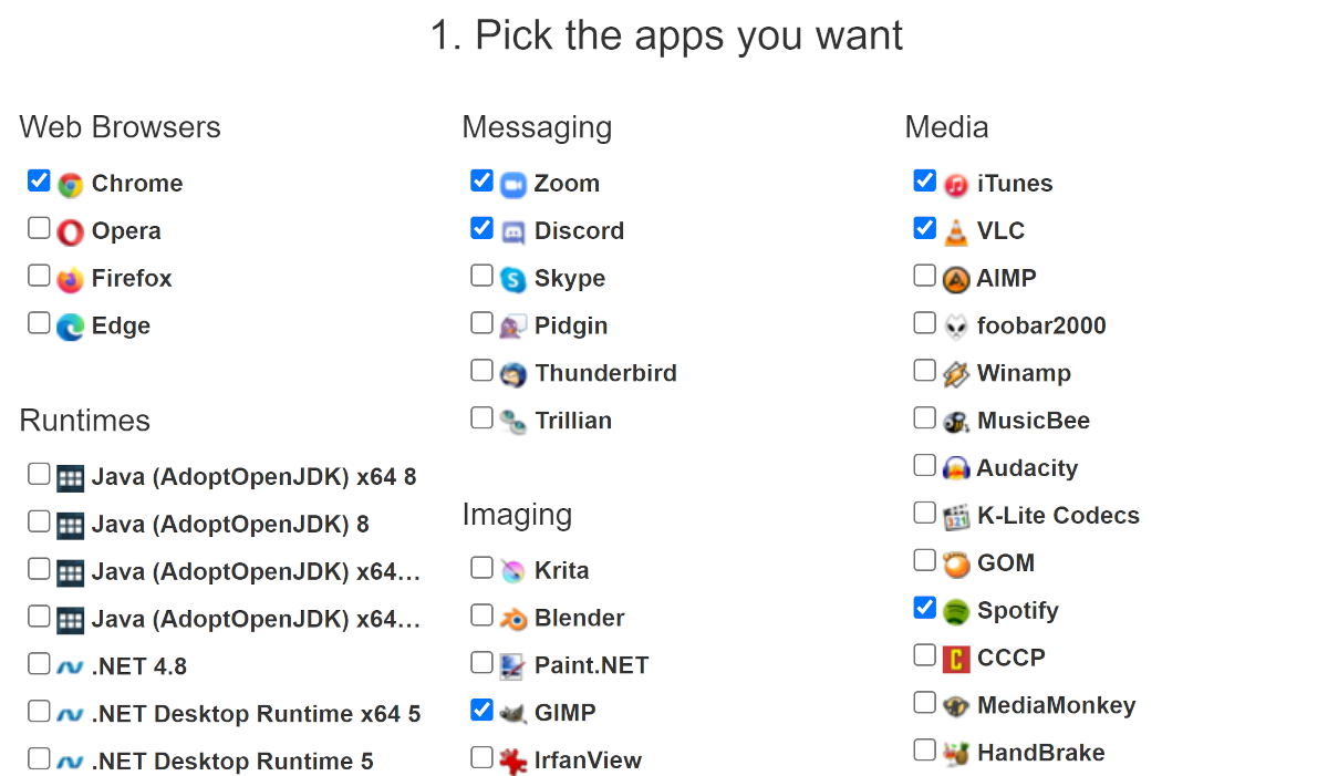 Ninite is useful tool for installing multiple programs at once. Check the boxes next to the software you want then click Get Your Ninite.