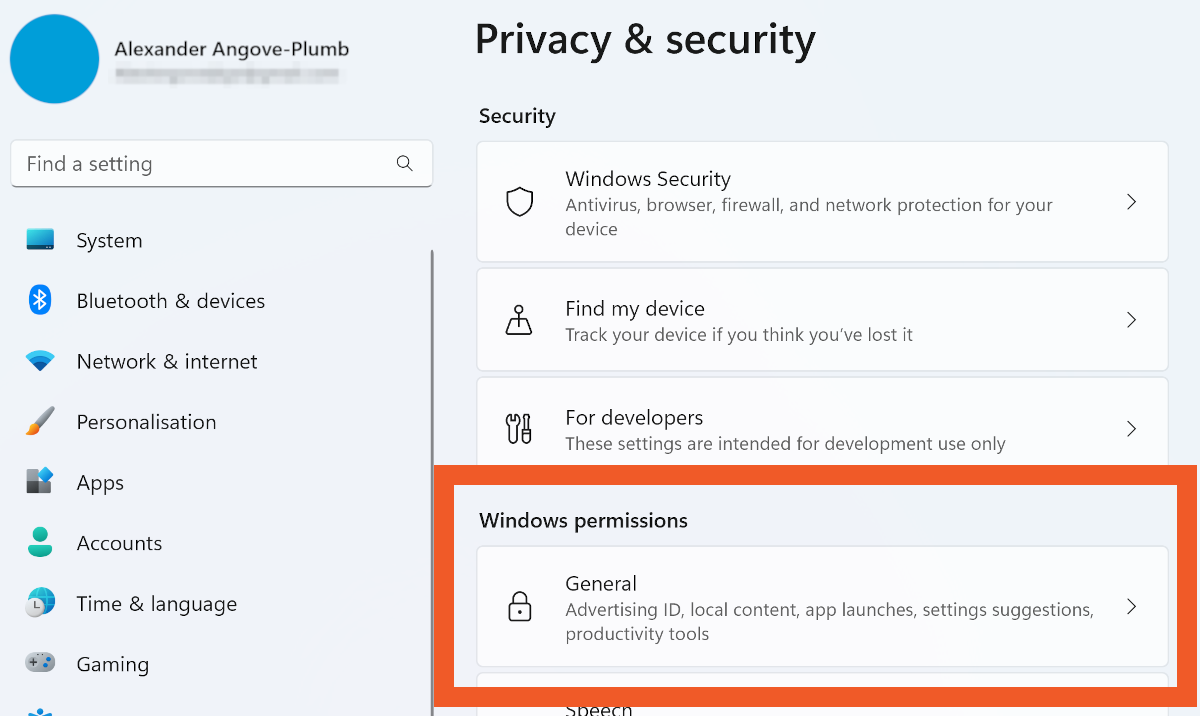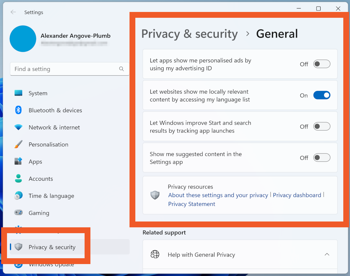 Press the Start key, type Privacy and select Privacy settings. This will open the privacy menu in its General section. Decide which of the four toggles you’d like to leave on, but only the language-based one is particularly useful.