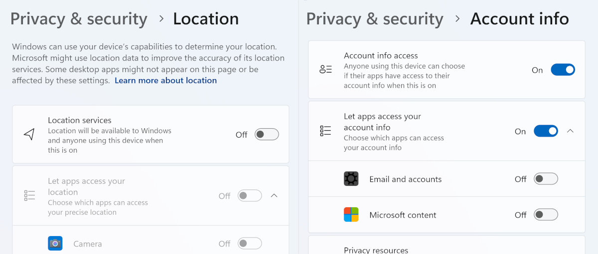 Go back to the main Privacy & security menu and click Account info. From here, control which apps can access your account information. You can disable this feature entirely, but some apps might not work properly.
