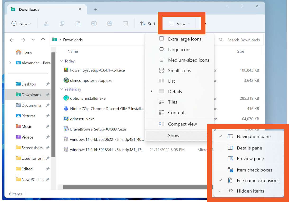 Follow the same steps again and click Hidden items. This will ensure you can see hidden files and folders, which are good to have visible for the rare occasions when you need them. It also means malware that’s installed itself as a hidden item will be revealed.