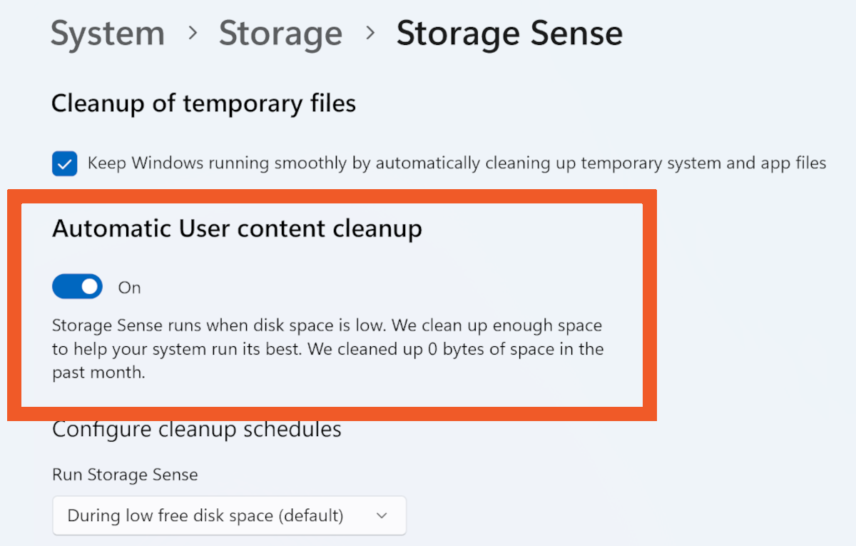To set it up, press the Start key, type Storage Sense, hit Enter and click the right-arrow next to Storage Sense. Click the toggle to turn on Automatic User content cleanup, then adjust the settings to your needs.