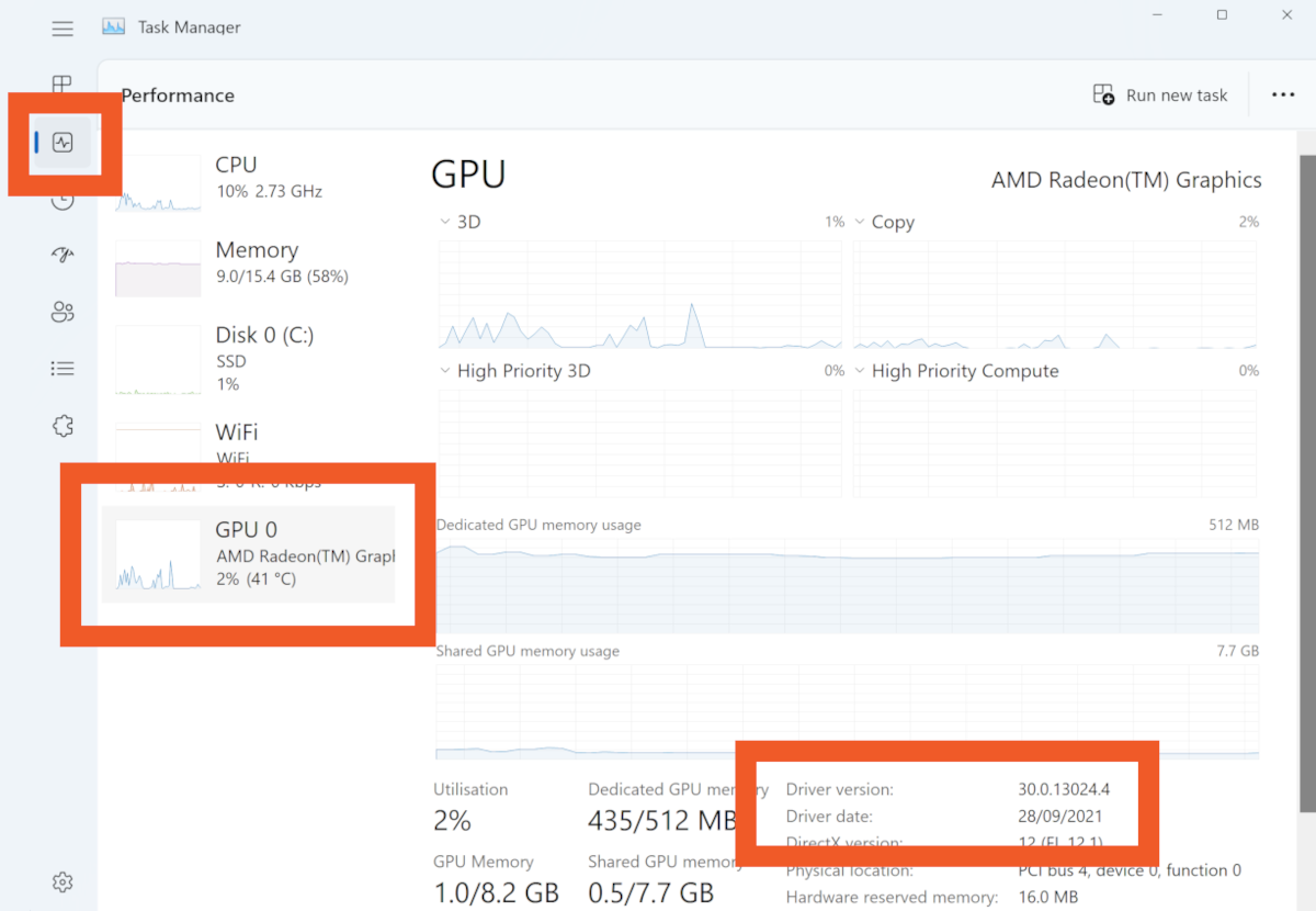 To find your GPU’s name, press Ctrl + Shift + Esc to open Task Manager. Click on the Performance icon on the left, then GPU. Your GPU’s name will be in the top right of the window. Also take note of the Driver date and Driver version information in the bottom right, which might be helpful in figuring out if your drivers are out of date.