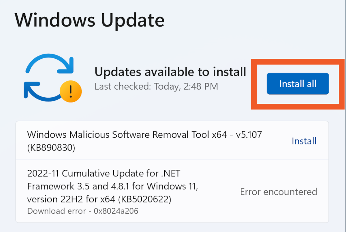 If any options have an “Error encountered” message, this might be sorted out once you click Install all. If not, do a web search using the update name and error code to find a solution.