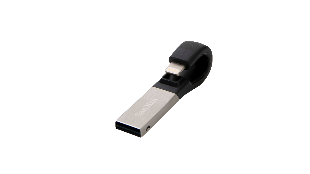 The Sandisk iExpand drive has both USB Type-A and Lightning connectors, along with software for file transfers to iPhone and iPad.