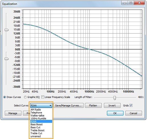 - First, press Ctrl + A to highlight the waveform, then go to Effect > Equalization, click the dropdown menu next to Select Curve, click RIAA, then OK to apply the equalisation.