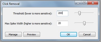 - Next step is to remove clicks and pops. Go to Effect > Click Removal to set the click/pop limitations. Threshold detects clicks. A lower number will increase the detection sensitivity, but pushing it too far can cause Audacity to start removing elements from the music, damaging the sound quality. Spike width is similar, except a higher number equals greater sensitivity. Play with these settings and press Preview to hear a sample. Once you’re happy with the level of sensitivity, click OK to apply the settings.