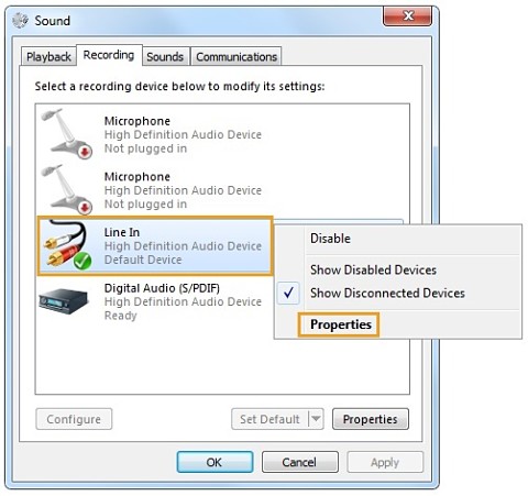 - Right-click the Audio icon in the Taskbar next to the clock, click Recording devices. Look for a device with Line In in the description, right-click it and select Set as Default Device to ensure that your PC will only record audio from the turntable.