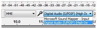 - Look for four dropdown menus towards the right side of the Toolbar, and click the second dropdown menu, that’s adjacent to MME. The second toolbar will display a list of input devices. Select the option that includes Digital Audio (S/PDIF) in the title. The surrounding text will vary depending on your computer and turntable model. If this isn’t available, select the first available option then follow the steps in Test the settings. If the waveform doesn’t appear, stop recording and pick another option from the dropdown menu.