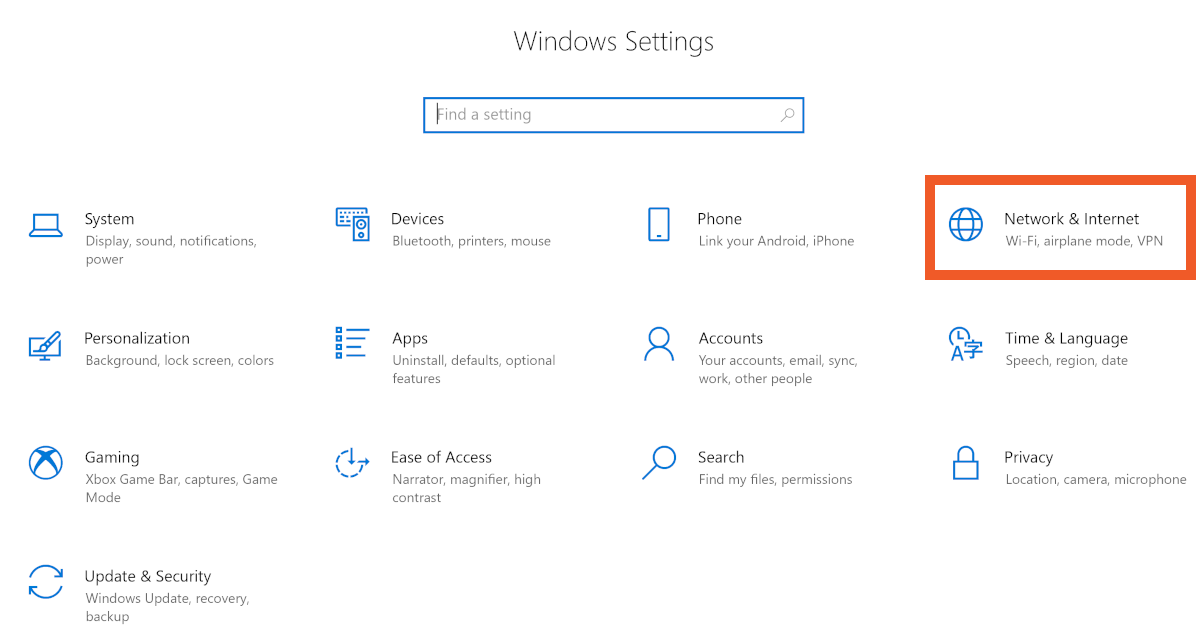 Changing the DNS settings for a Windows device is easy. Go to your Start menu > Settings > Network & Internet.