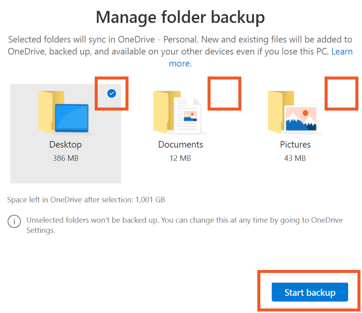 In the Backup tab, click Manage backup. Tick which of these three options you'd like to automatically sync with OneDrive, then click Start backup.