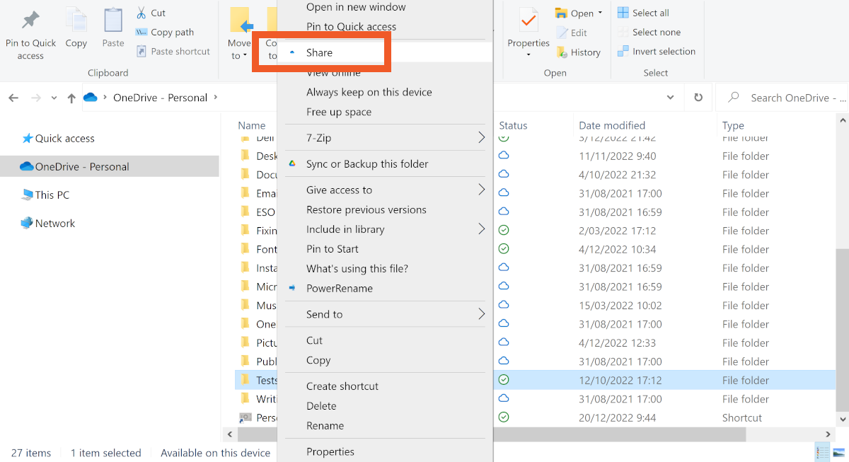 To share a OneDrive folder, right-click on it and select Share.