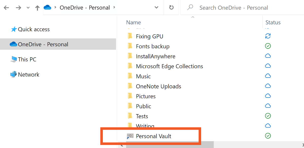 The encrypted Personal Vault folder sits at the bottom of your other OneDrive folders.
