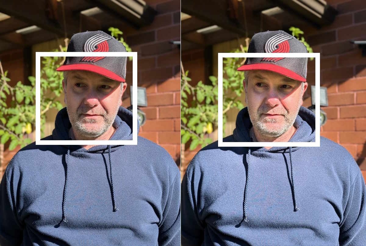 Portrait Light: an AI feature that can attempt to lighten any unwanted shadows on a face. The left image is the default; the right image is lightened using the Portrait Light feature.