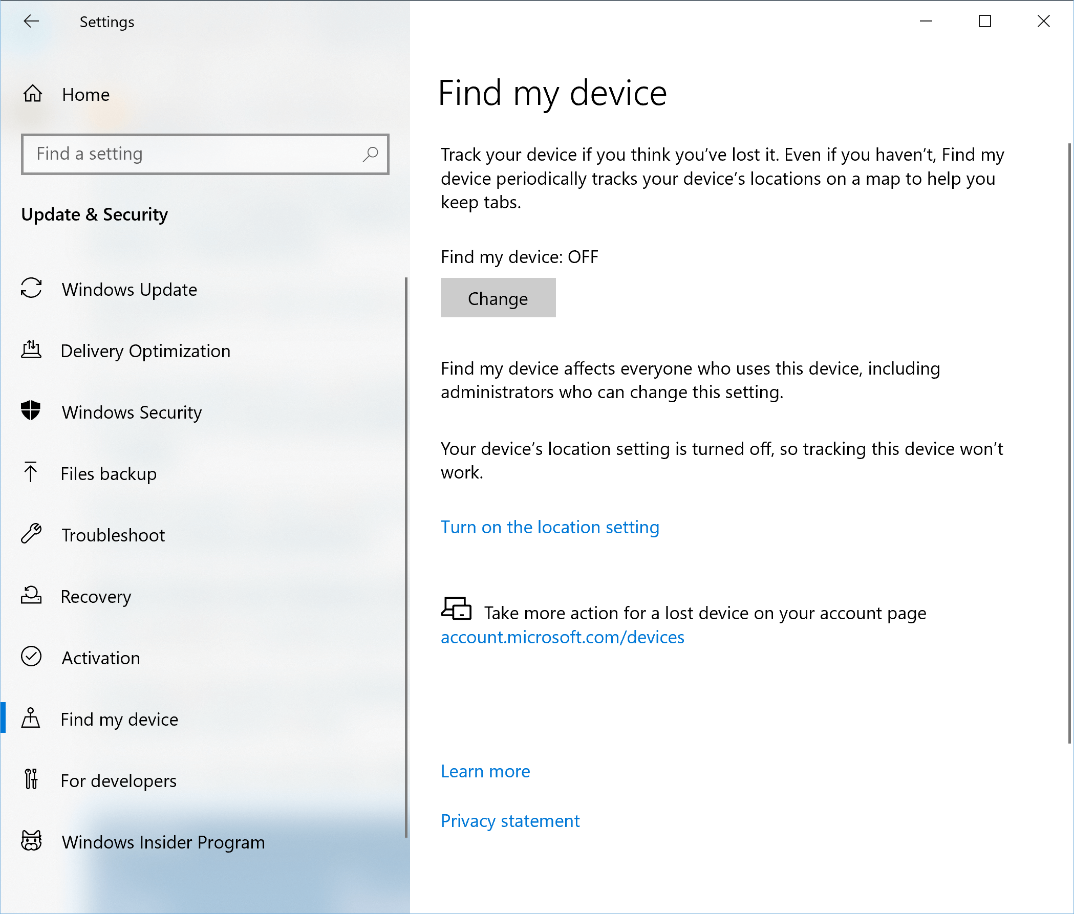 Press the Start key, type “find my device” and select the top result. Toggle on the Find my device option.