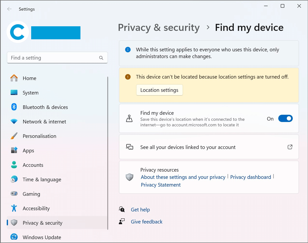 You can also go to Settings > Privacy & Security > Device finders. Under “Find my device”, it should say “On”. If it doesn’t, select Find My Device and tap the toggle.