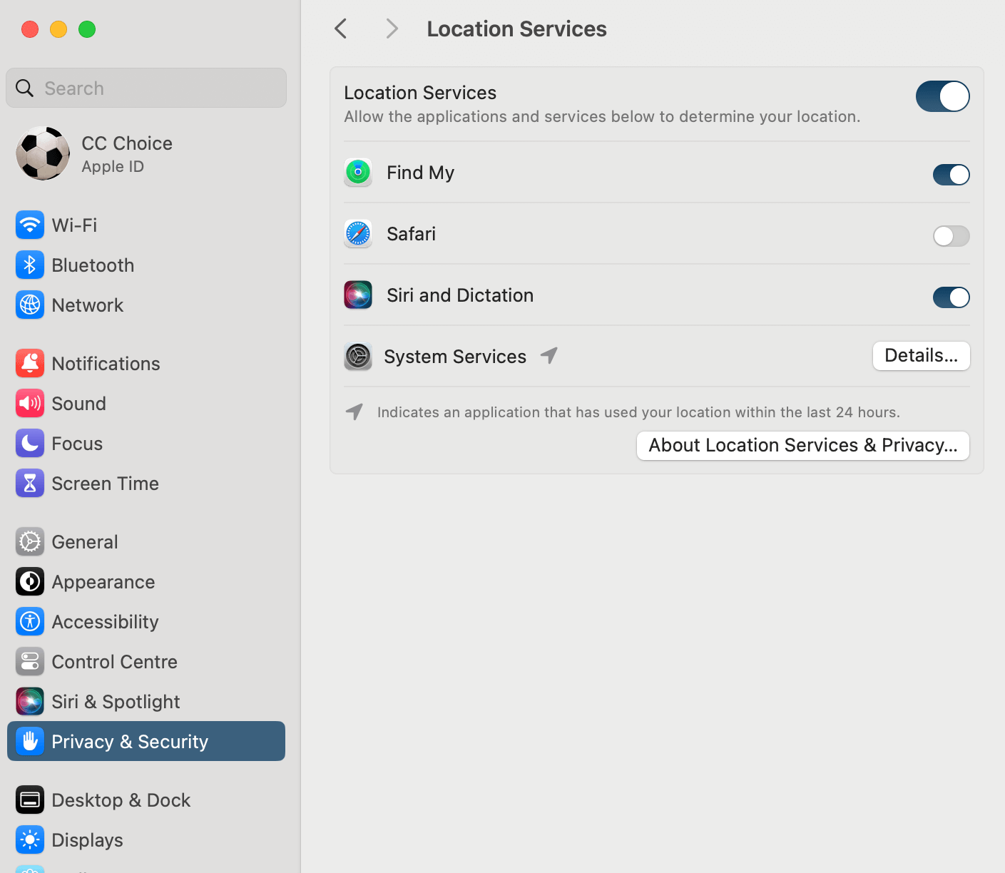 To enable location services, click the Apple menu in the top left corner of the desktop, then System Settings > Privacy & Security > Location Services. Turn on Location Services, then turn on Find My in the same menu screen.