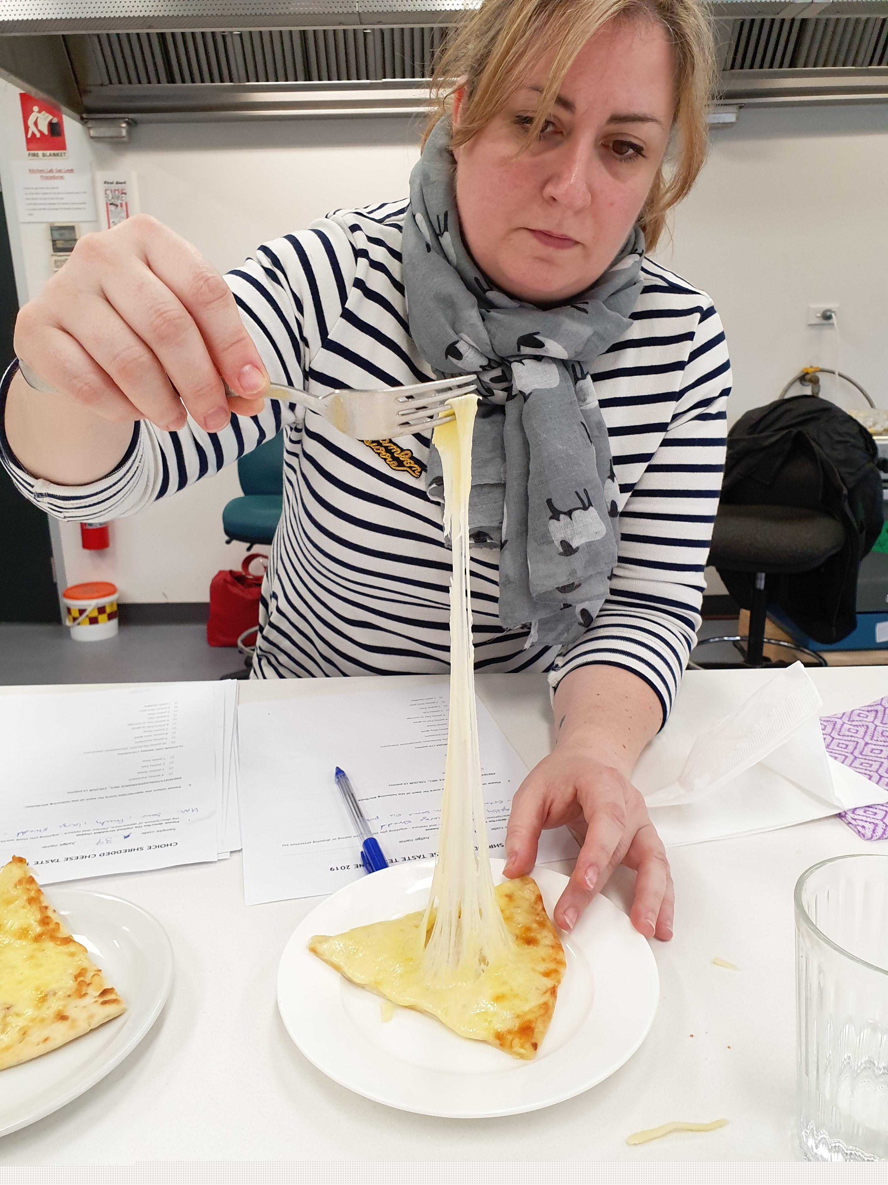 - Experts say: “Strong cheesy flavour, with good texture and stretch. Light browning and oily patches on surface from the melt.”