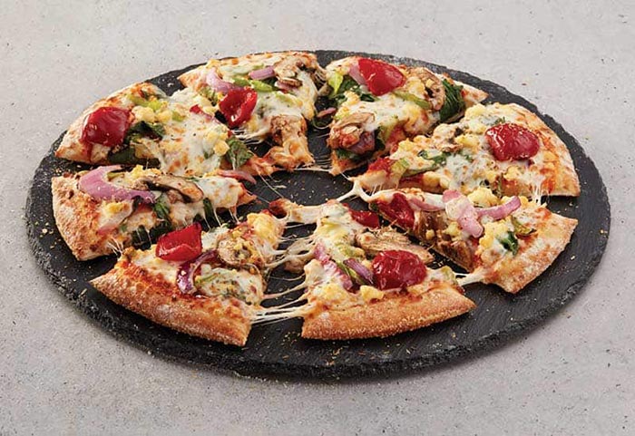 You’ll be eating 25% less kilojoules if you choose the Vegan Deluxe pizza (original pan crust) over the double-cheese-topped Veggie Sensation (original pan crust), for example.