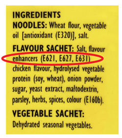 Flavour enhancers such as glutamates (621-625) are found in many foods, including packet soups, flavoured noodles, sauces and savoury snacks. When glutamate touches the taste receptors on our tongue, it gives food a savoury taste (sometimes known by the Japanese-derived word ‘umami’). Mixed with a meal, glutamate balances, blends and enhances the total perception of flavour.