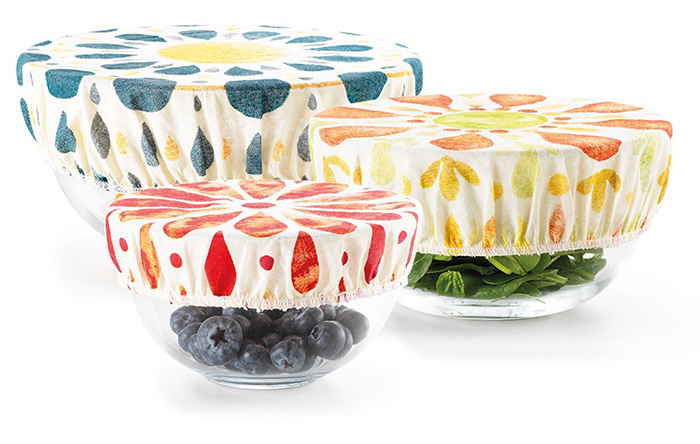 What is it and what’s it made from? Cotton canvas covers with elasticised sides that fit snugly over bowls to keep food fresh and nasties out.