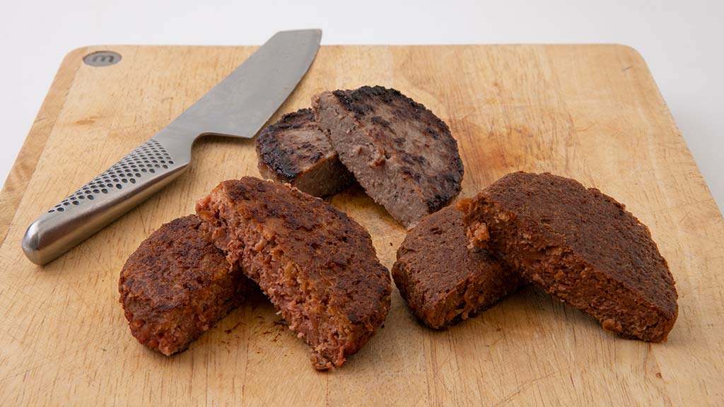 “Is this a Beyond Burger? This is the most meat-like of the samples. Almost disturbingly so. Strong, smoky, meaty flavour. But slightly unnerving for a vegan.”