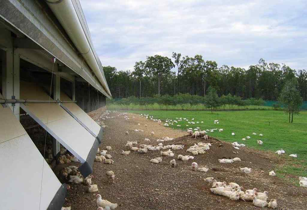 FREPA accredited free range chickens are only let outdoors when they’re ‘fully feathered’. There’s no cap on the amount of chickens per metre in the outdoors, and in the shed they are stocked at up to 15 birds per square metre. There is also no specified limit on the amount of artificial light used.