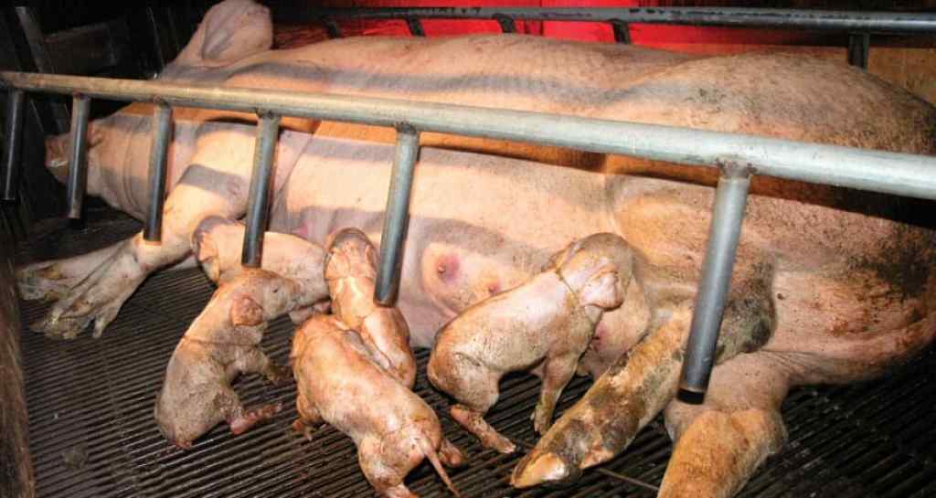 Less well known is that sows are routinely moved to narrow steel farrowing (or gestation) crates to have the piglets, which separate them from their young by a metal bar. Farrowing crates are designed to protect piglets from being crushed by their mother, but they’re considered inhumane by some because sows are confined in these for up to four weeks, only able to stand up and lie down on metal floors.