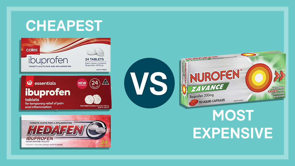 Aldi, Coles and Woolworths all had the cheapest ibuprofen (24 packs of Hedafen Ibuprofen, Coles Ibuprofen and Essentials Ibuprofen, respectively) at 6c per pill.
